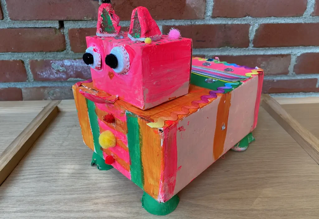 Abstract sculpture of a house with painterly splashes of paint in bright colors.